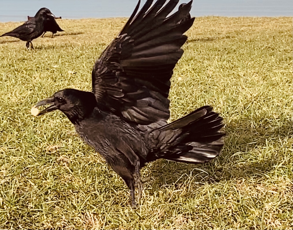 Crows do certainly have the ability to not only recognise, but also assess people on an individual basis. They will get closer to me- someone they have learned does not try to harm them and who they associate with food- than they do other people they encounter on the green. For example, I’ve noticed the Black Bloc tend to stay away from those holding leads in particular, who they understand will probably have a dog or two who likes to chase them. But for me, that isn’t a good enough excuse to try and encourage them, no matter how much it would thrill me.